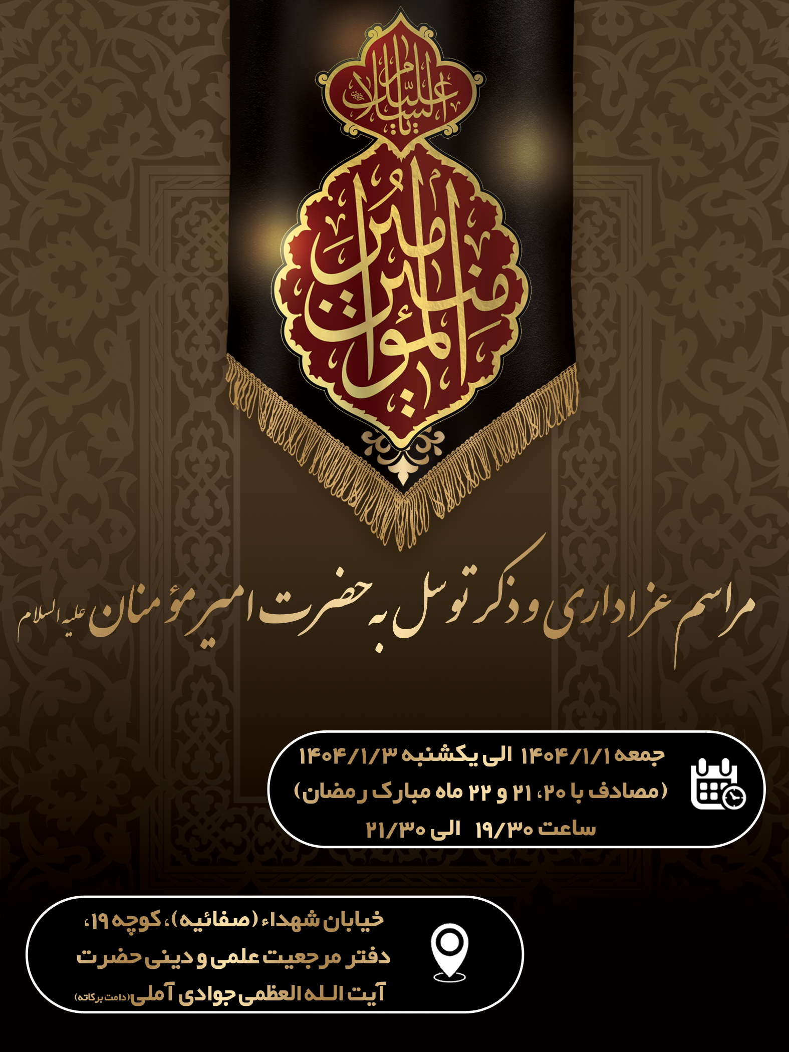 به مناسبت فرا رسیدن ایام شهادت حضرت امام علی سلام الله علیه ،مراسم عزاداری و ذکر توسل به مدت سه شب در دفتر آیت الله العظمی جوادی آملی در قم برگزار میگردد