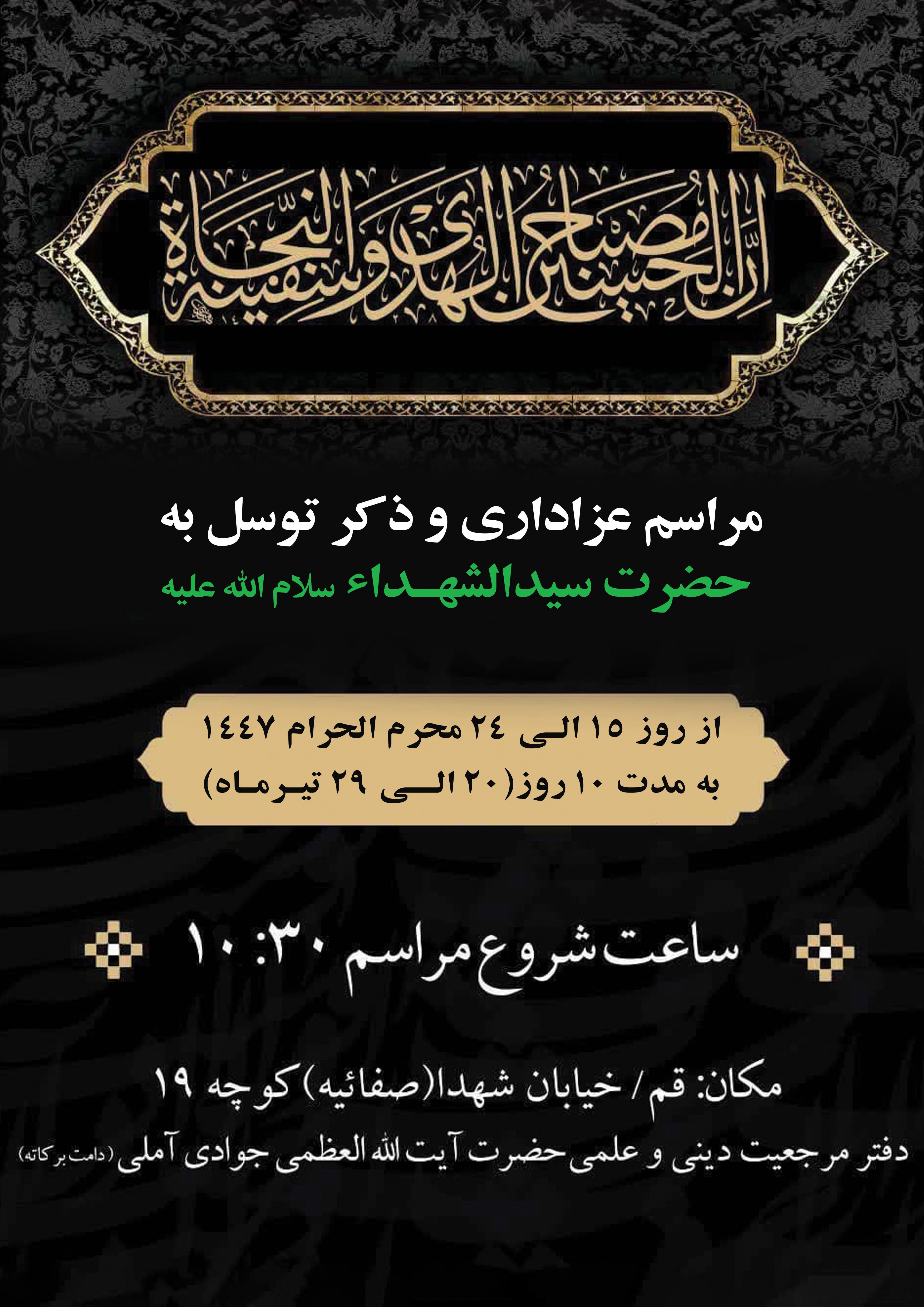 مراسم عزاداری و ذکر توسل به حضرت سیدالشهداء سلام الله علیه، در دفتر آیت الله العظمی جوادی آملی در قم به مدت 10 روز برگزار میگردد.