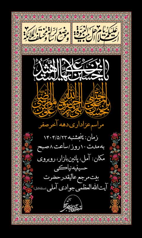 به گزارش دفتر آیت الله العظمی جوادی آملی در شهرستان آمل،مراسم عزاداری دهه آخر ماه صفر در بیت معظم له در شهرستان آمل برگزار میگردد.
