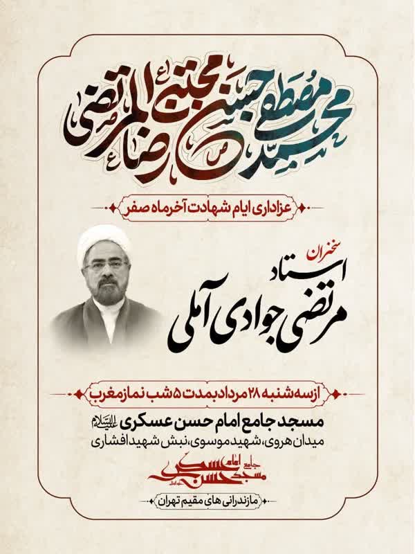 مراسم عزاداری ایام شهادت آخر ماه صفر در مسجد جامع امام حسن عسکری علیه السلام در تهران با سخنرانی استاد مرتضی جوادی آملی برگزار میگردد