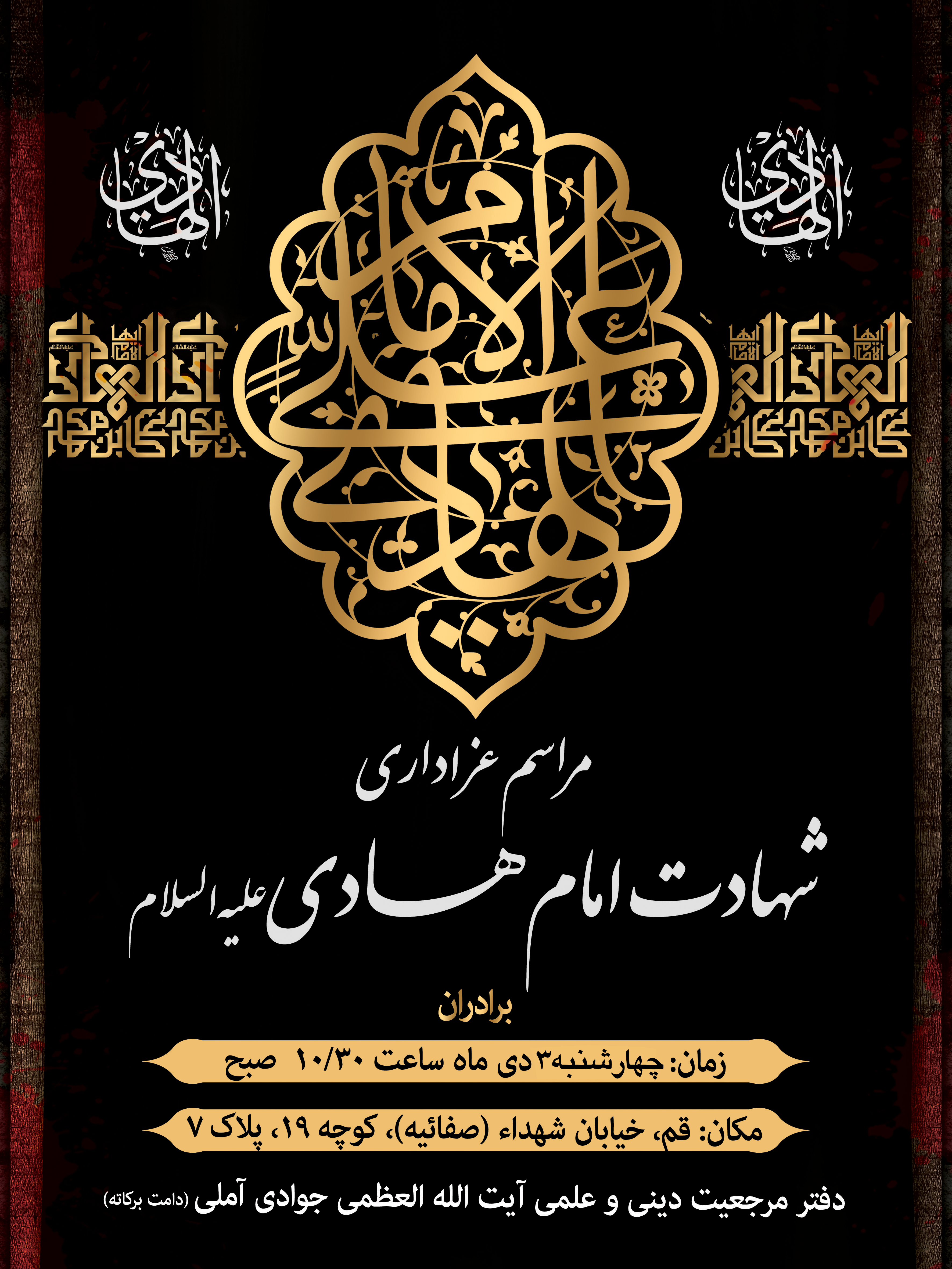 به اطلاع می رساند مراسم سوگواری به مناسبت فرا رسیدن سالروز شهادت حضرت امام هادی سلام الله علیه در دفتر آیت الله العظمی جوادی آملی در قم برگزار میگردد