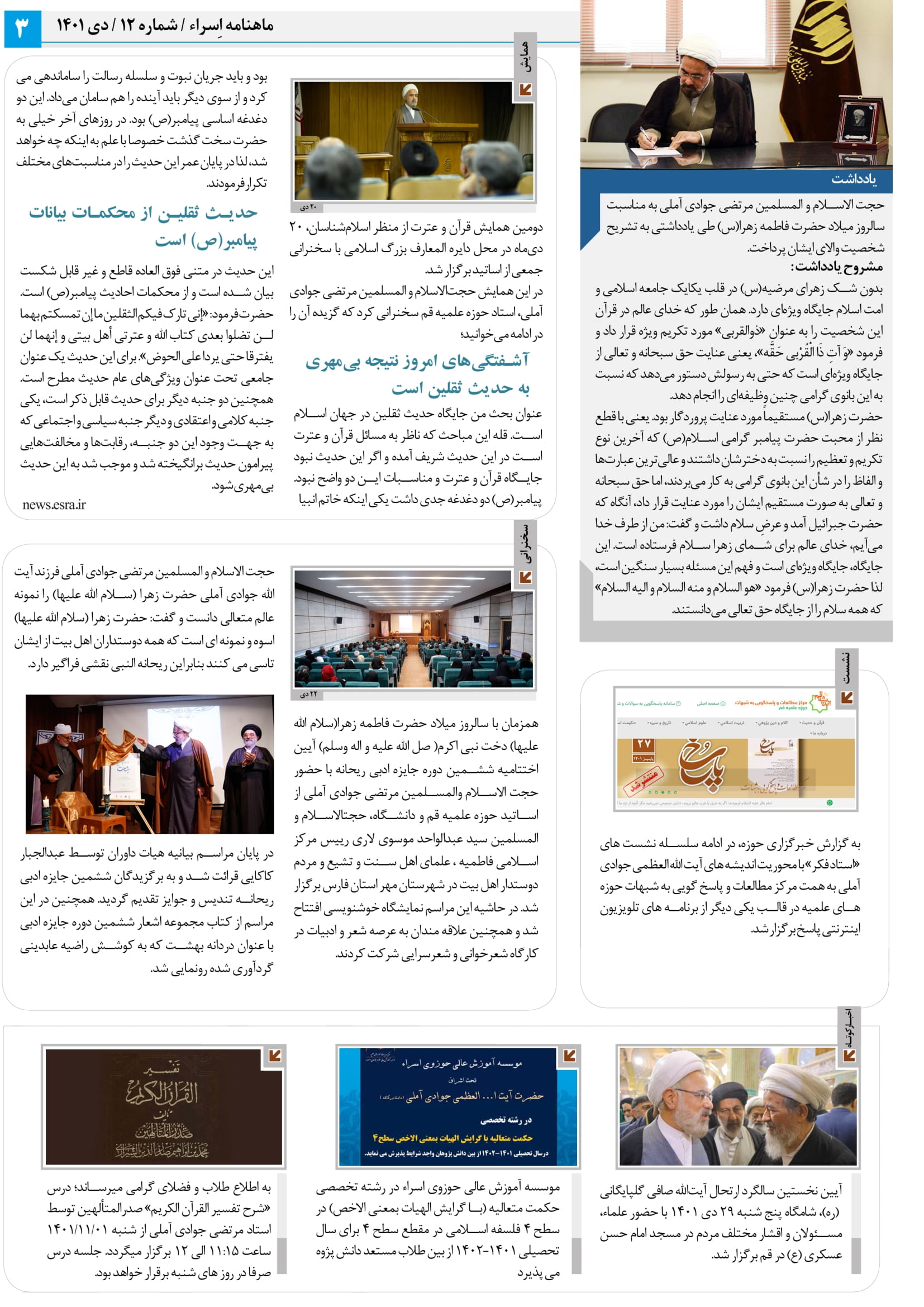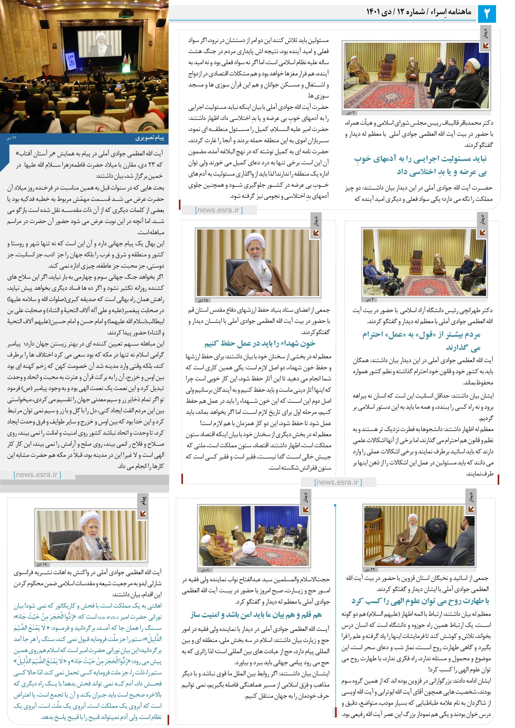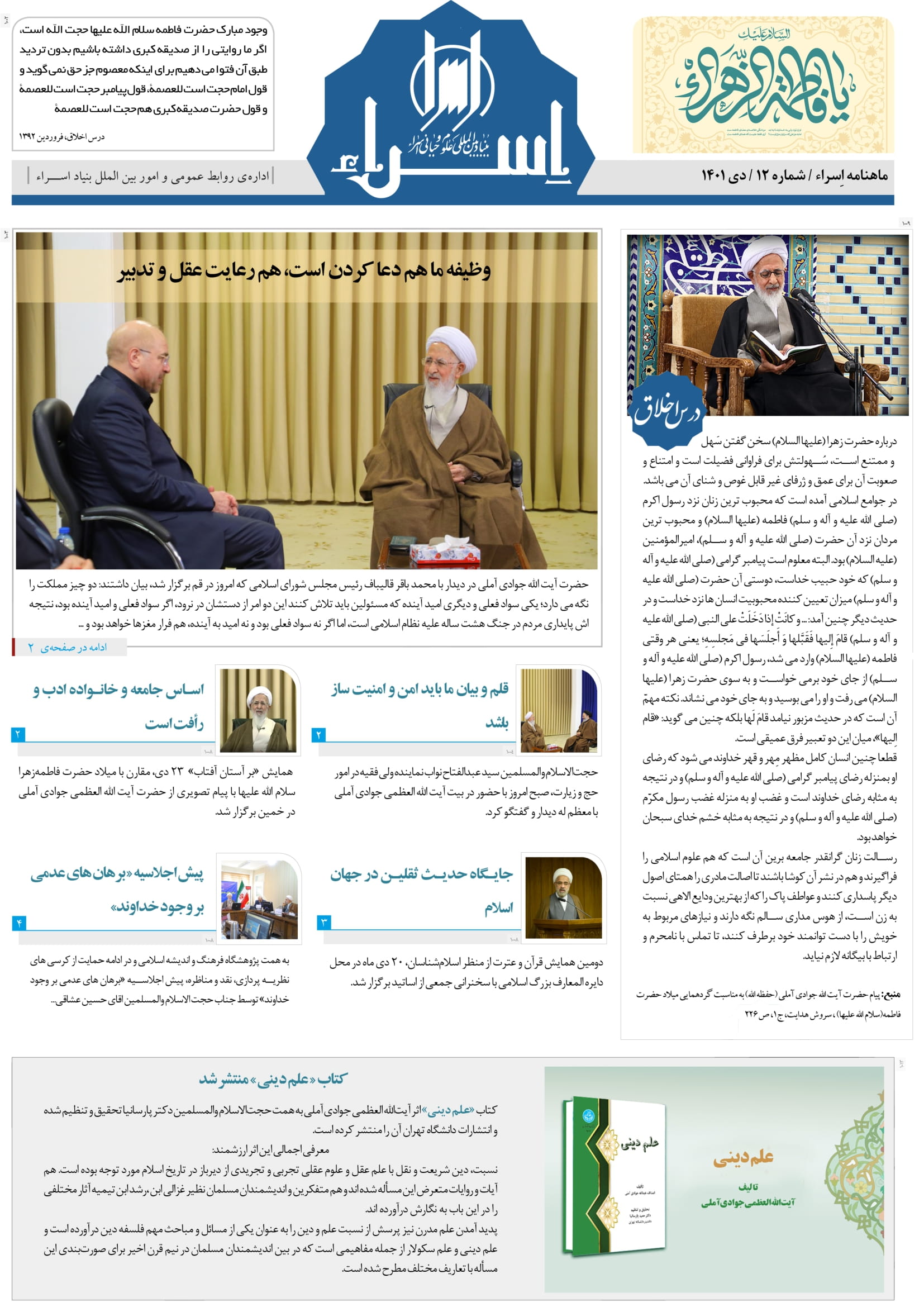 پایگاه اطلاع رسانی اسراء: به همت اداره روابط عمومی و امور بین الملل بنیاد اسراء، ماهنامه اسراء که مروری است بر اخبار و فعالیت های ماهانه بنیاد اسراء (شماره12، دی ماه 1401) آماده و منتشر شد.