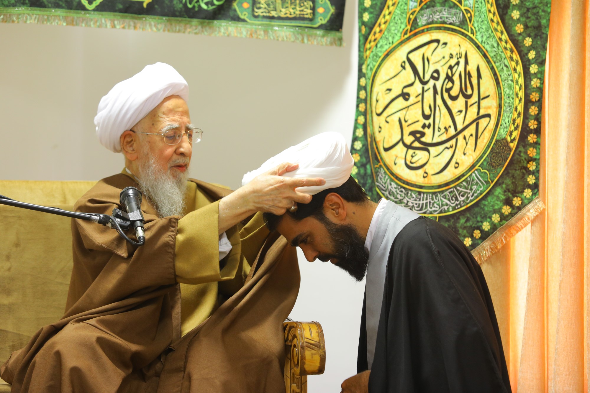 مراسم عمامه گذاری جمعی از طلاب توسط آیت الله العظمی جوادی آملی در سالروز 17 ربیع الاول - خبرگزاری اسراء