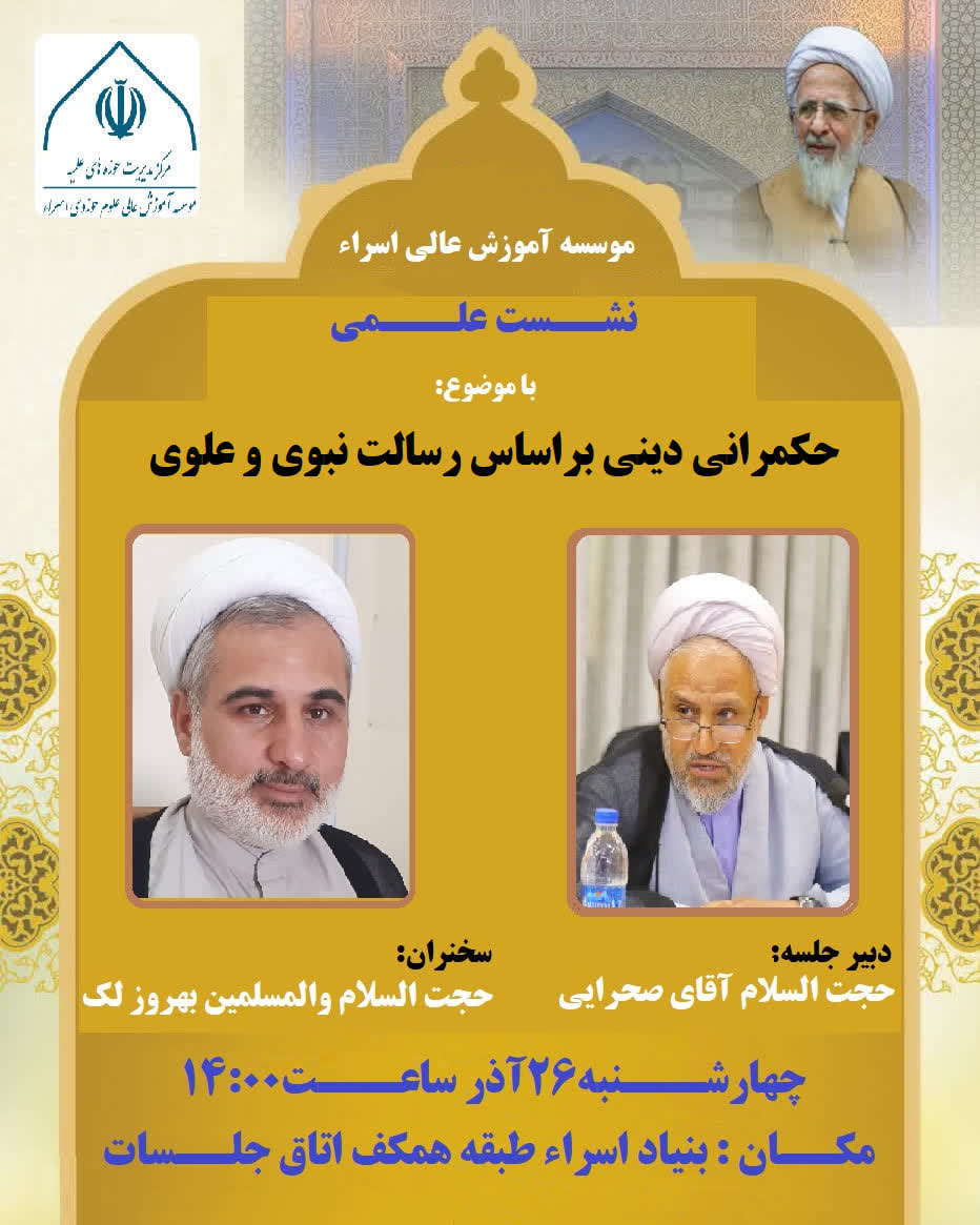 نشست علمی «حکمرانی دینی بر اساس رسالت نبوی و علوی» روز چهارشنبه ۲۶ آبانماه، ساعت ۱۴، در سالن کنفرانس بنیاد بینالمللی علوم وحیانی اسراء برگزار خواهد شد.