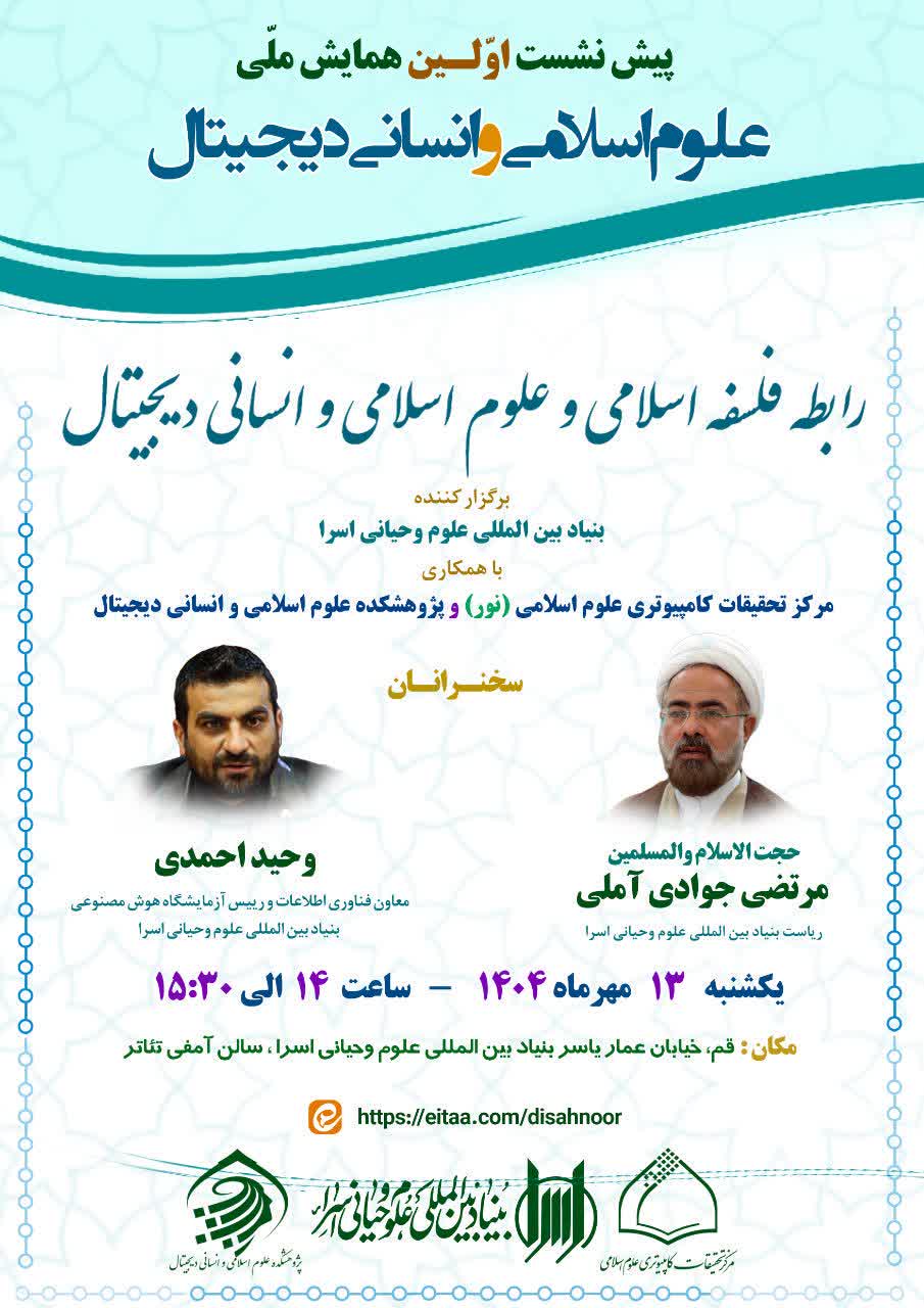 پیشنشست اولین همایش ملی علوم اسلامی و انسانی دیجیتال با موضوع رابطه فلسفه اسلامی و علوم اسلامی و انسانی دیجیتال و سخنرانی حجتالاسلام والمسلمین مرتضی جوادی آملی (ریاست بنیاد بینالمللی علوم وحیانی اسرا) و مهندس وحید احمدی (معاون فناوری اطلاعات و رئیس آزمایشگاه هوش مصنوعی بنیاد اسرا) برگزار می گردد.